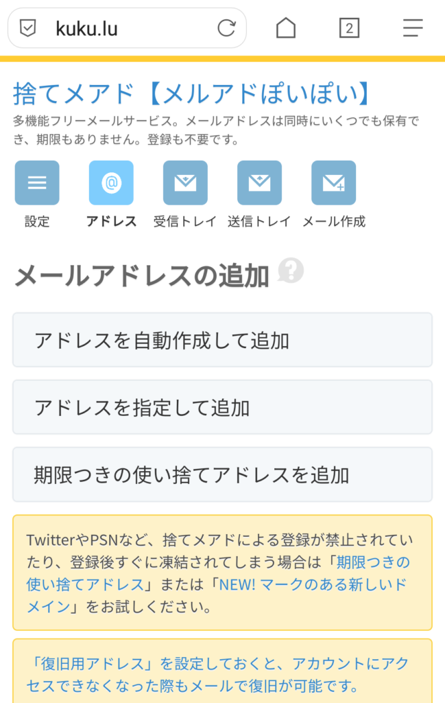 このサービス、何がいいかと言うと、メールアドレスの有効期限が無期限なんです。