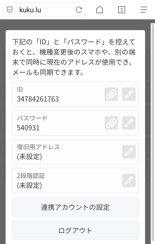 下記の「ID」と「パスワード」を控えておくと、機種変更後のスマホや、別の端末で同時に現在のアドレスが使用でき、メールも同期できます。