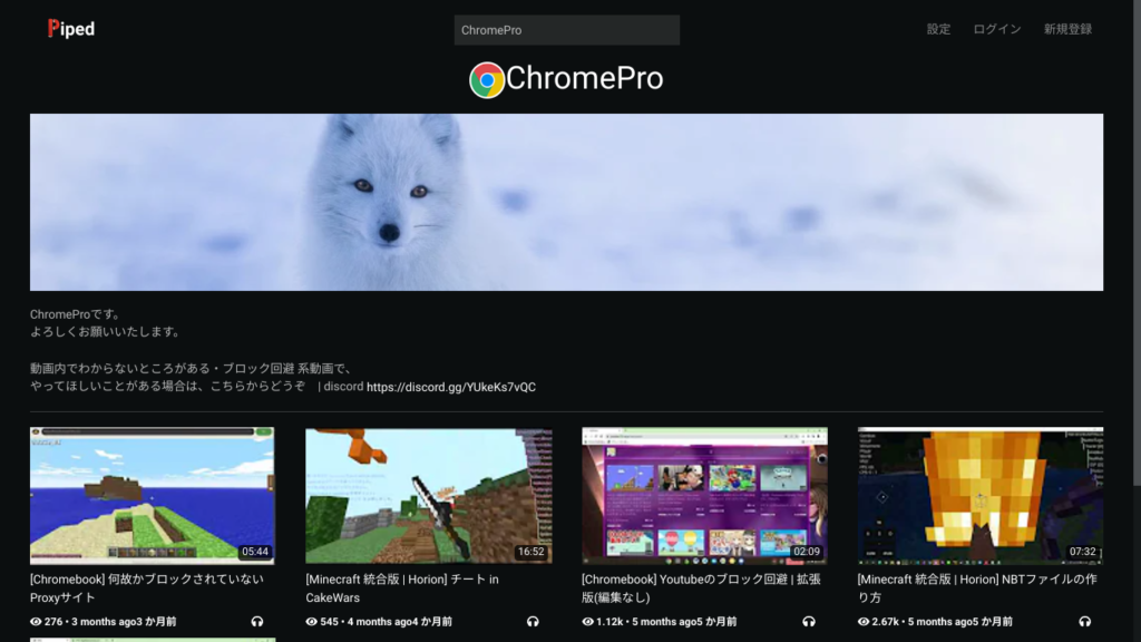 ChromeProです。 自分で見つけたブロック回避方法は、この後、載せておきます。 画像ブロックされている人へ [Chromebook] YouTubeブロック回避方法.pdfダウンロード 情報提供元 – ネタ提供 さんより (BlogBooks Library | コメント欄) 注意事項 ブロック環境によっては、無理な可能性があります。 目次ガイドブック1. Piped2. ViewTubeガイドブック 1. Piped まず、Pipedを開きます。 後は、検索というところで、自分の見たい動画やチャンネルを検索してください(こんな感じ) 2. ViewTube ViewTubeを開きます 後は、さっきと同じように、自分の見たい動画やチャンネルを検索してください 読んでいただきありがとうこざいました。 Discordサーバーにも、入っていだだけると嬉しいです(うるさい)