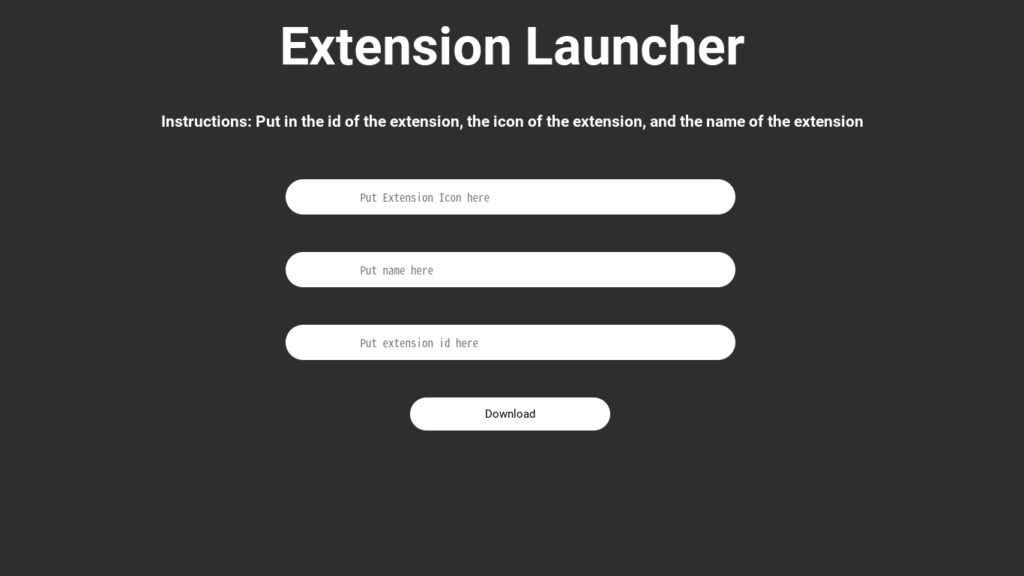 "<center><head><h1>Extension Launcher </h1></head></center><center><h3>Instructions: Put in the id of the extension, the icon of the extension, and the name of the extension</h3></center><center><br><input id='icon' placeholder='Put Extension Icon here'></br></center><center><br><input id='name' placeholder='Put name here'></br></center><center><br><input id='extension' maxlength='32' placeholder='Put extension id here'></br></center><center><br><button id='submit'>Download</button></br></center>\n<style> textarea{border-radius: 25px; margin: 1 auto;margin-center: auto;margin-center: auto; text-align: center; align: center; display:inline-block;height:400px}*{box-sizing:border-box}body{padding:13px;font-size:110%;color:#fff;background-color:#2e2e31}h1{text-align:center;font-size:70px}h2{text-align:left;font-size:175%}button,input,pre,select,textarea{border-radius: 21px; color:#000;font-size:15px}h1,h2,h3,h4,button,label,p,select{font-family:Roboto,sans-serif}hr{border:none;border-bottom:3px solid #fff}input,kbd,pre,textarea{font-family:monospace;border:none}input,select,textarea{background-color:#fff;border-radius:25px; padding:13px 17px;border:none}button,input{background-color:#fff;padding:13px 100px;margin:20 5px 5px 0}input{width:600px;border-radius:25px}textarea{white-space:pre;float:center;width:60%;border-radius:25px; 0 0 10px;resize:none;background-color:#99edc3;margin-bottom:15px}pre{border-radius:25; 10px 10px 0;padding:13px;float:right;margin:0 0 25px;width:40%;overflow-y:scroll;word-break:break-all;white-space:pre-line;background-color:#1c8e40}button{border:none;border-radius:25px; cursor:pointer;transition:filter 250ms}button:hover{filter:brightness(.8)}.gg{background-color:#99edc3}a{color:#99edc3;transition:color 250ms}a:hover{color:#1c8e40}</style> "