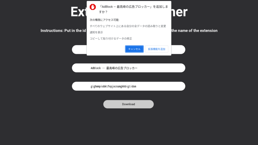 その後それを https://chrome.google.com/webstorex にアクセスしてブックマークレットを実行し、拡張機能のアイコン、ID、名前(何でもいいです)を入れてください。