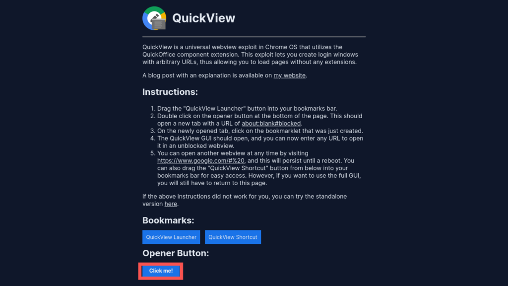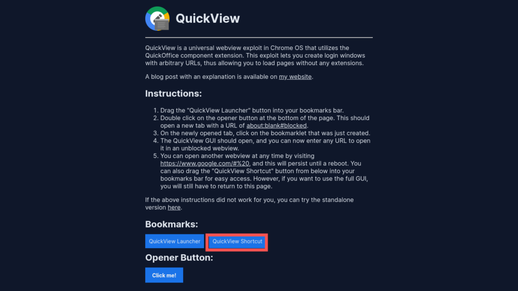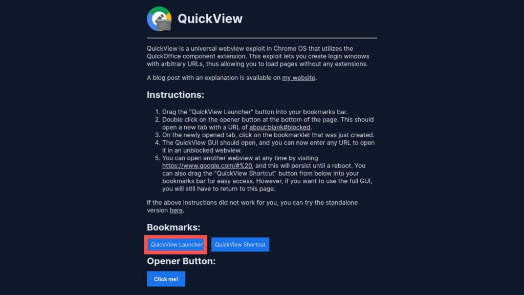 • QuickView Exploit を開き、下の画像の赤線の部分(Quick View Launcher)をブックマークに登録してください。(ドラッグすれば登録できます)