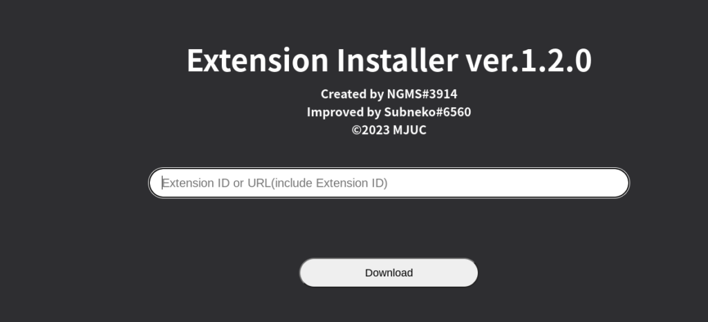 javascript: document.write("<center><head><h1 style='color: white; margin-top: 100px; font-size: 50px; line-height: 1;'>Extension Installer ver.1.2.0</h1><h3 style='color: white; margin-top: -10px; font-size: 20px; line-height: 1;'>Created by NGMS#3914</h3><h3 style='color: white; margin-top: -10px; font-size: 20px; line-height: 1;'>Improved by Subneko#6560</h3><h3 style='color: white; margin-top: -10px; font-size: 20px; line-height: 1;'>©2023 MJUC</h3></head></center><style>body {background-color: #2e2e31;}</style><div style='display: flex; flex-direction: column; justify-content: center; align-items: center; height: 100vh;'><div style='display: flex; flex-direction: column; justify-content: center; align-items: center;'><input id='extension' placeholder='Extension ID or URL(include Extension ID)' style='width: 250%; height: 50px; font-size: 20px; border-radius: 25px 25px 25px 25px; color: black; padding-left: 20px; margin-bottom: 100px; margin-top: -150px;'><button id='DL' style='border-radius: 10px; width: 300px; height: 50px; font-size: 18px; color: black; margin-bottom: 200px; border-radius: 30px;'>Download</button></div></div>");String.prototype.getExtensionID = function () { if (/^[a-zA-Z]{32}$/.test(this)) { return this.toString(); } else if (this.match("chrome.google.com")) { const pathname = new URL(this).pathname.split("/"); const extensionID = pathname[pathname.length - 1]; return /^[a-zA-Z]{32}$/.test(extensionID) ? extensionID : false; } return false;};document.getElementById("DL").addEventListener("click", () => { let extensionID = document.getElementById("extension").value.getExtensionID(); if (extensionID) { chrome.webstorePrivate.beginInstallWithManifest3( { id: extensionID, manifest: '{\n"update_url": "https://clients2.google.com/service/update2/crx",\n\n"manifest_version": 2,\n"content_security_policy": "script-src \'self\'; object-src \'self\';",\n"minimum_chrome_version": "71.0.0.0",\n"offline_enabled": true,\n"content_scripts":\n[\n{\n"js": [\n"page.js",\n"content.js"\n],\n"matches": [ "file:///*", "http://*/*", "https://*/*" ],\n"run_at": "document_start",\n"all_frames": true\n}\n],\n"browser_action": {\n"default_icon": {\n"19": "images/icon_grey19.png",\n"38": "images/icon_grey38.png",\n"16": "images/icon_grey16.png",\n"24": "images/icon_grey24.png",\n"32": "images/icon_grey32.png"\n},\n"default_title": "Extension",\n"default_popup": "action.html"\n},\n"icons": {\n"32": "images/icon.png",\n"48": "images/icon48.png",\n"128": "images/icon128.png"\n},\n"incognito": "split",\n"name": "Extension",\n"short_name": "Extension",\n"version": "4.18.0",\n"description": "The world\'s most popular userscript manager",\n"default_locale": "en",\n"background": {\n "page": "background.html"\n},\n"options_page": "options.html",\n"options_ui": {\n"page": "options.html",\n"chrome_style": false,\n"open_in_tab": true\n},\n"commands": {\n"toggle-enable": {\n"description": "Toggle enable state"\n},\n"open-dashboard": {\n"description": "Open dashboard"\n},\n"open-dashboard-with-running-scripts": {\n"description": "Open dashboard with the current tab\'s URL used as filter"\n},\n"open-new-script": {\n"description": "Open new script tab"\n}\n},\n"permissions": [\n"notifications",\n"unlimitedStorage",\n"tabs",\n"idle",\n"webNavigation",\n"webRequest", "webRequestBlocking",\n"storage",\n"contextMenus",\n"chrome://favicon/",\n"clipboardWrite",\n"cookies",\n"declarativeContent",\n"<all_urls>"\n],\n"optional_permissions" : [ "downloads" ]\n}\n', }, () => chrome.webstorePrivate.completeInstall(extensionID, function () {}) ); } else { alert("Extension ID is Invalid!"); }});