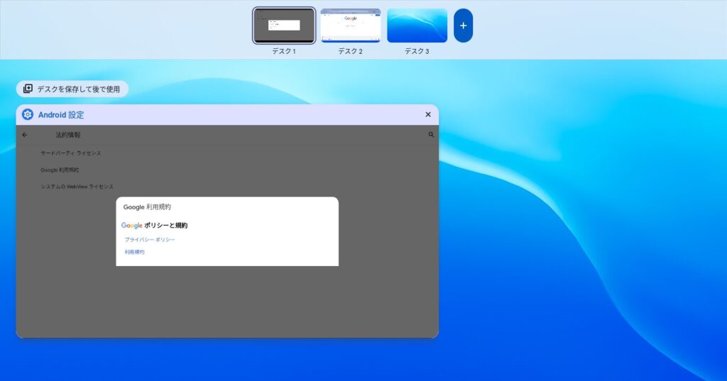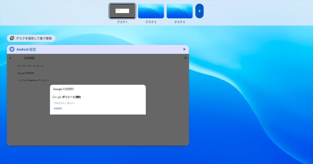 □||キー で「Android 設定」を開いていたデスクに戻ります