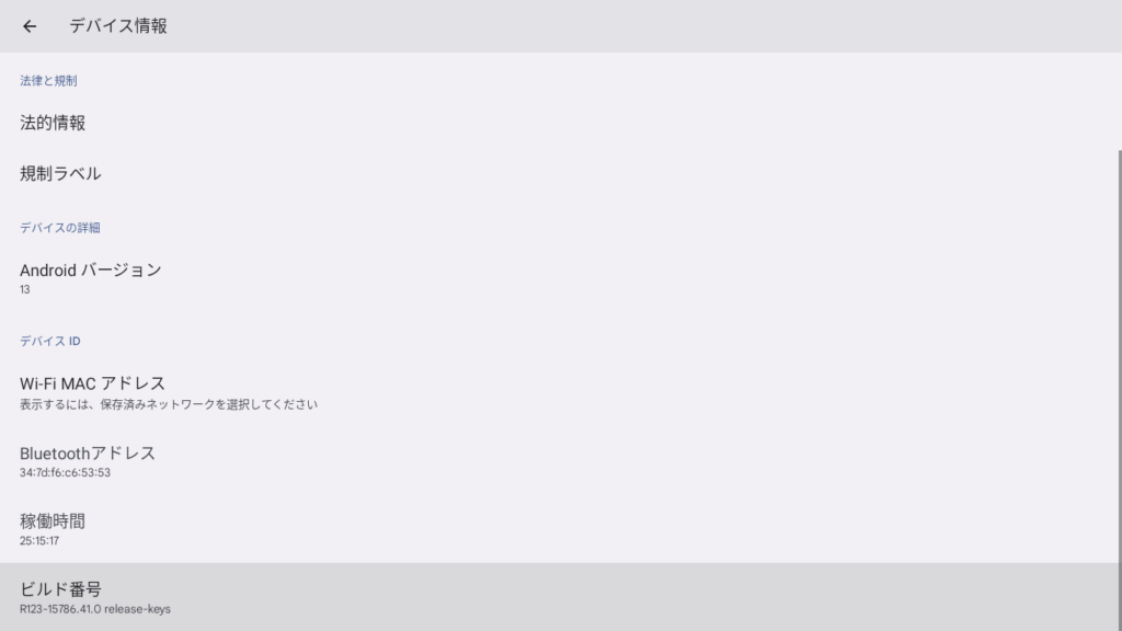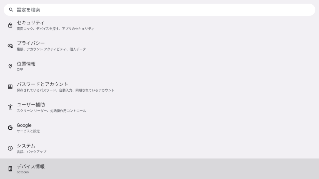 • Android設定のアプリが開かれるので、一番下までスクロールして「デバイス情報」をクリック