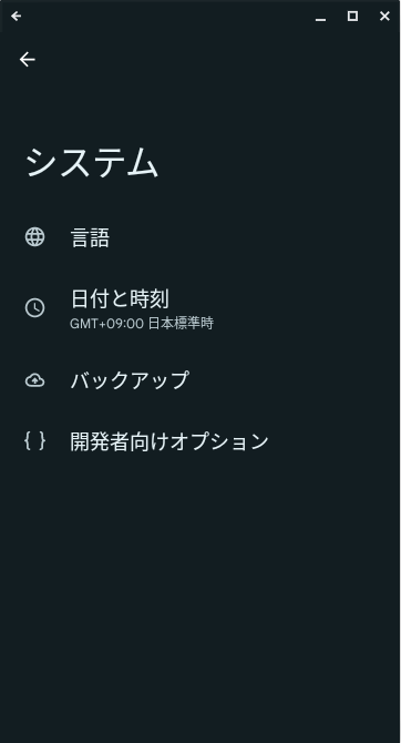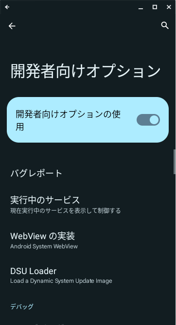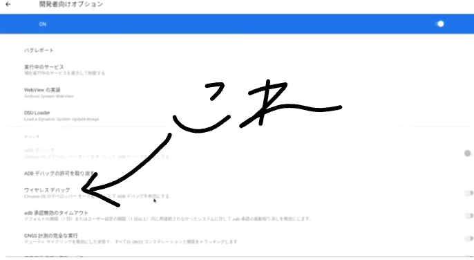 – 追加情報: 制限のかかっていないchromebook(chromeOS 123)でテストしましたが、「ワイヤレスデバッグ」の項目が無効化されており、使えないおそれがあります