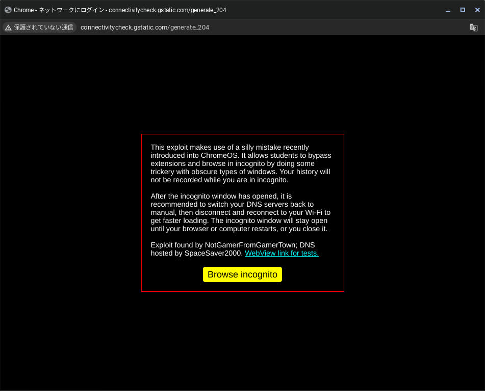 ロードが終わらない場合は、「ctrl + T」を押すことで「Browse incoginto」のボタンを押した後の手順までスキップ可能です