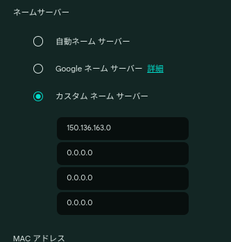 - 表示された4つの欄の一番上を「150.136.163.0」に変更し、他3つは「0.0.0.0」のままにしておく