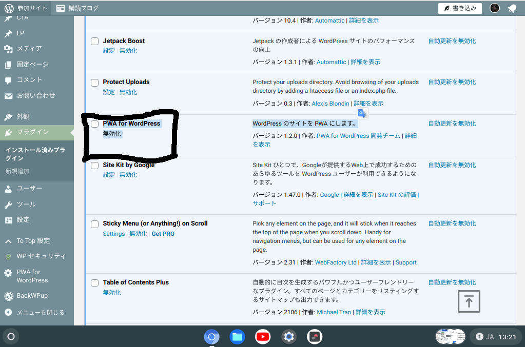 - 下の写真にもある「PWA for WordPress」というプラグインが原因でした。